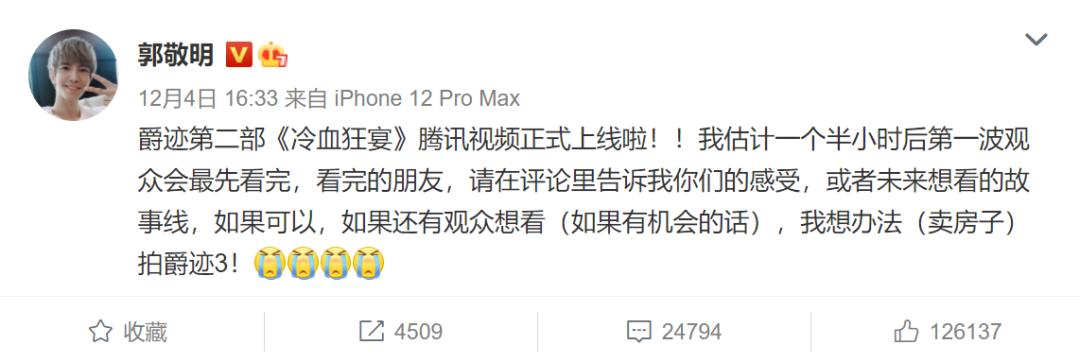 影片上线当天,郭敬明发微博称:如果可以,如果还有观众想看(如果有机会的话),我想办法(卖房子)拍爵迹3!
