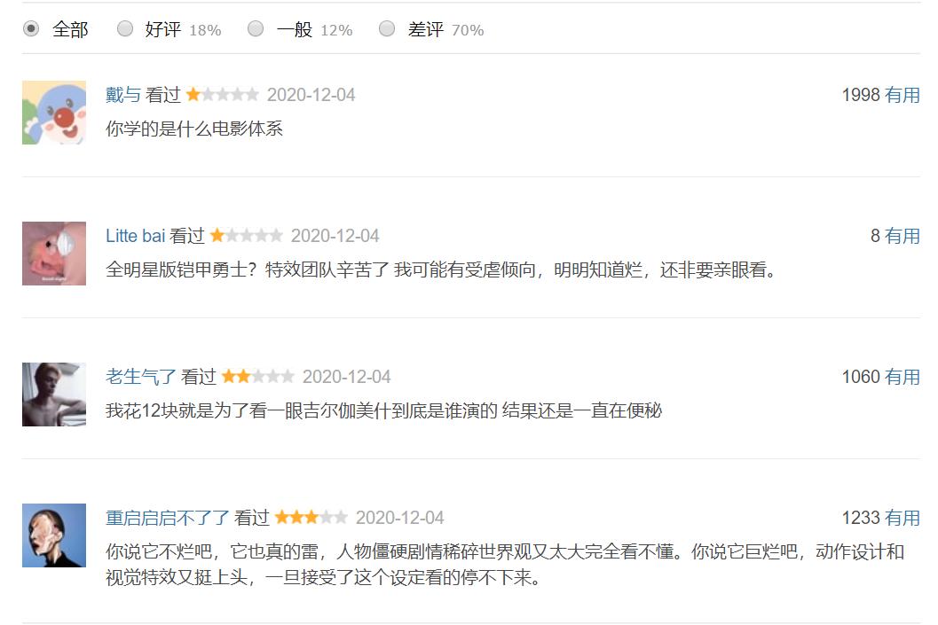每经记者注意,虽然腾讯视频显示该影片目前为内地电影排行榜第一名,但依旧没能逃脱口碑“魔咒”,截至目前,豆瓣评分仅3.9分,70%的观众给出了差评,不少网友们更是直呼看得“如坐针毡、如芒在背”。“人物僵硬、剧情稀碎、世界观太大完全看不懂。”“你学的是什么电影体系?”