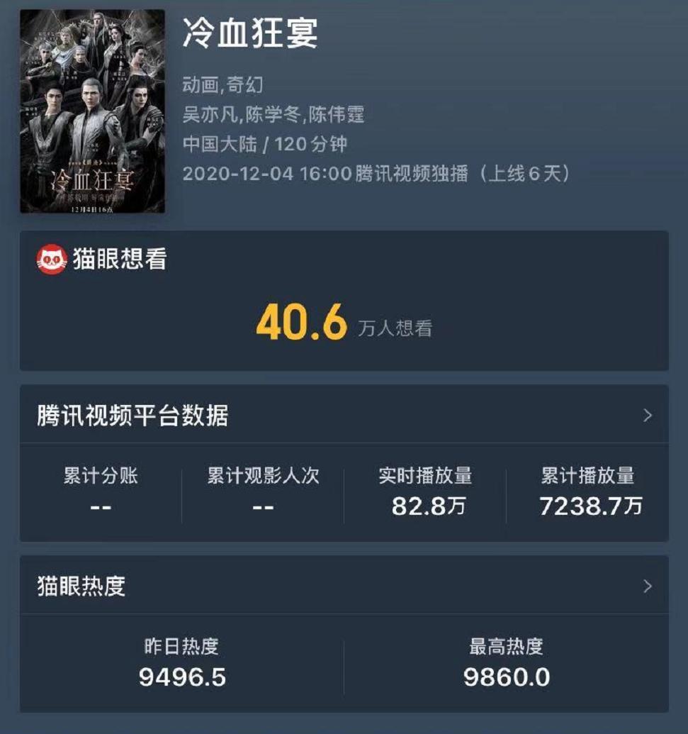 12月4日,《冷血狂宴》在腾讯视频上“云首发”,观众需付费观看,VIP优惠价为12元,非会员价为24元。猫眼专业版显示,截至12月9日,该影片上线5天在腾讯视频播放7238.8万次。