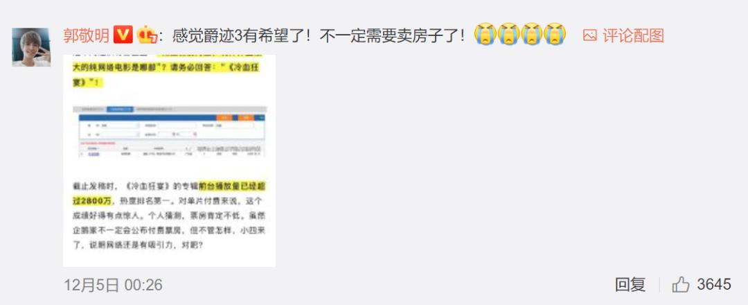 对于网友们的差评,郭敬明似乎并不在意,影片上线第二天,其在微博中称:“感觉爵迹3有希望了!不一定需要卖房子了!”
