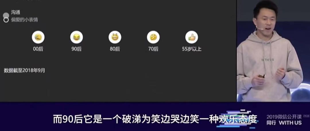 2019微信公开课上曾公布,2018年,00后爱用捂脸,90后最爱破涕为笑,像极了20多岁的人生,总是边哭边笑;80后最爱呲牙笑脸,笑对一切;70后最爱偷笑;55岁以上的人喜欢发竖起大拇指的“强”,为众人慷慨点赞。如今,更新后的新表情更是让广大打工人大呼精准,“叹气、苦涩、裂开”构成了打工人的悲催日常。