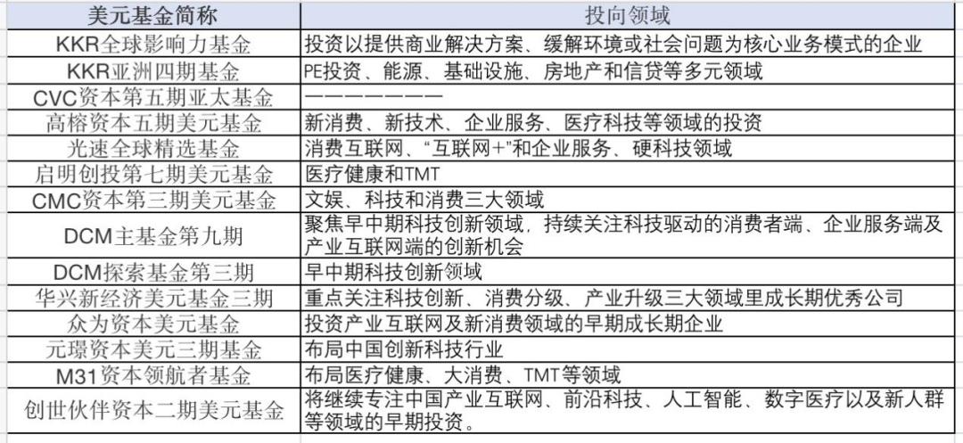 高榕资本五期美元基金、启明创投第七期美元基金、M31资本领航者基金、创世伙伴资本二期美元基金等基金皆把医疗健康和前沿科技列为投向领域。此外,新消费也不乏热度,比如高榕资本五期美元基金、CMC资本第三期美元基金、华兴新经济美元三期基金、M31资本领航者基金等的投向领域中皆包括新消费。