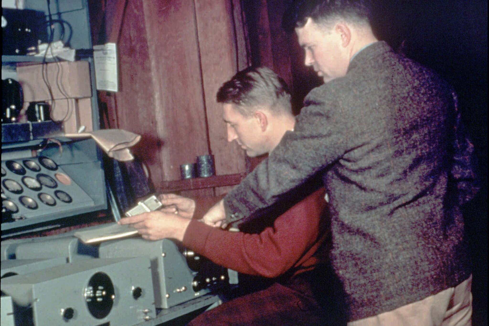 1939年,Packard先生(左)和Hewlett先生在车库里开发音频振荡器。图片来源:美联社