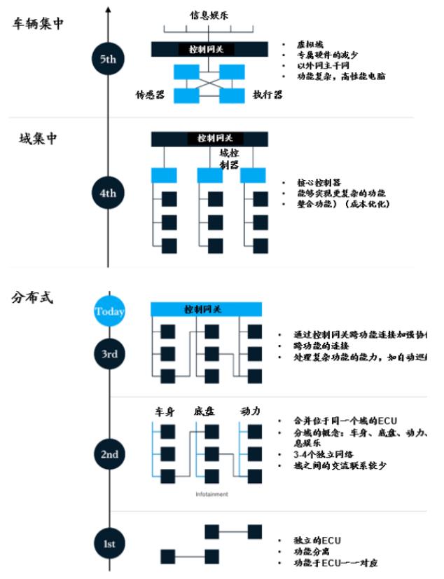 智能汽车一个极其复杂的系统性工程,根据麦肯锡的研究,汽车智能化要经历3大步:首先从当前的分布式控制到域控制,目前大家讲的智能座仓域、自动驾驶域等就是这个概念,最终目的要实现车辆集中的全车智能,如此方能实现软硬件解耦带来的生态效应,目前走在最靠前的是特斯拉。