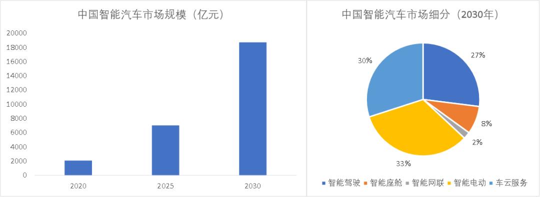 现在智能手机市场规模接近5000亿美元量级,但每年已经只能靠微创新反复来遮羞行业已经不再增长的事实。而智能汽车则是无可争议的朝阳产业,根据国金证券测算,2020年中国智能汽车整体市场规模仅2066亿元,在接下来的十年将以每年25%的速度增到到2030年的18735亿元;按照中国占全球的1/3简单测算,10年后全球智能汽车的市场规模将达到5.6万亿元。