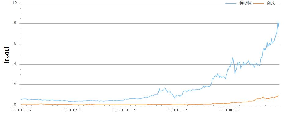 2020年,特斯拉全球销量接近50万辆,蔚来是4.37万辆,特斯拉市值8000亿美元,蔚来接近1000亿美元,如果单看市销率,目前蔚来的估值已经比特斯拉还贵。投资人都质疑特斯拉股价有泡沫,但跟蔚来相比之后,会发现特斯拉的估值似乎还可以更贵。