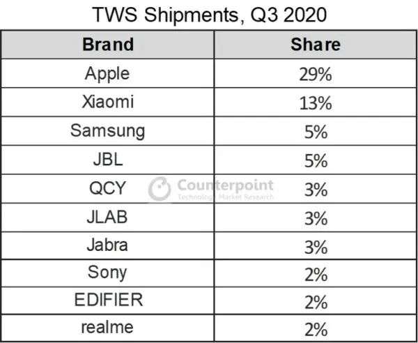最前线 | 市场机构:2020Q3全球TWS耳机市场,苹果第一,小米第二