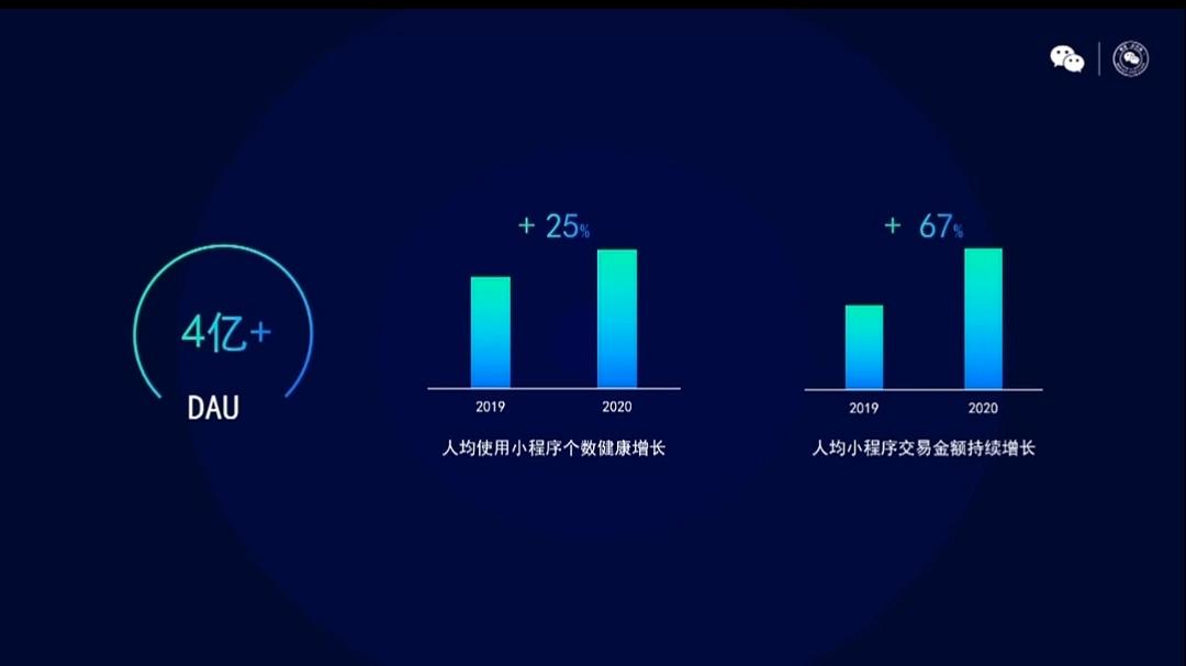 官方数据显示,微信小程序日用户数突破4亿,2020年人均使用小程序个数同比增长25%,人均小程序交易金额较2019上涨67%。