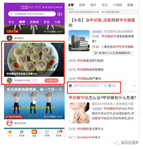 在糖豆广场舞上,无论是首页的“推荐”栏目,还是在“在家跳”、“小视频”等栏目的信息流中,都被塞进了不少电商、医疗引流的广告,甚至多数广告点一下链接就自动跳到另外一个网站了。譬如这个“甲状腺结节在饮食上注意什么”的医药广告,点进去后就直接跳到了由成都西部甲状腺医药竞价购买的广告展位上。