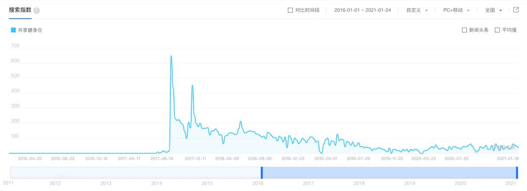 再到百度查询相关数据,发现健身仓的资讯关注日均值,已长达三年保持零记录。百度搜索日均值已下滑到每天30位,相较于2017年至2018年热度跌近70%。
