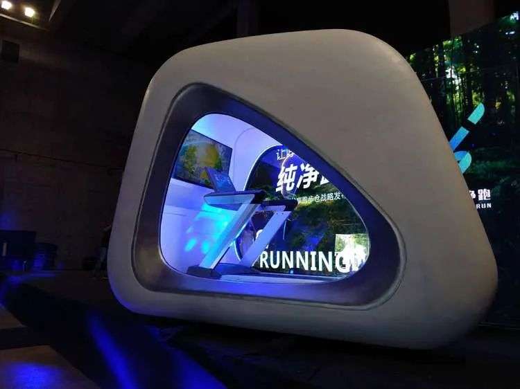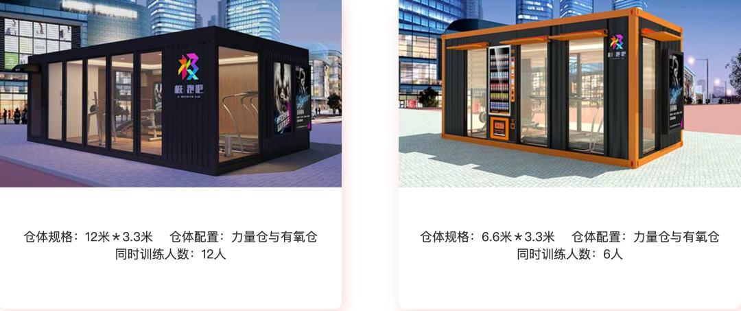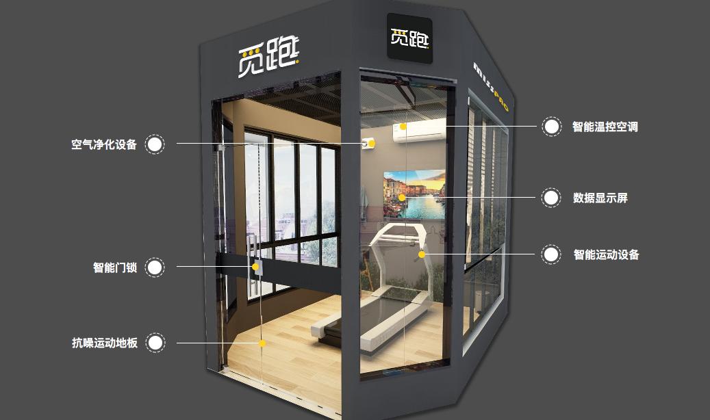 这种健身仓是一个小型健身空间,单人面积约为4平方米,仓体放置于社区中心地带,内置跑步机等运动器械,以及Wifi、空气设备等配套设施,通常按时计费,价格区间为0.2-0.6元/每分钟。如「觅跑」健身仓,占地5-6平方米,内置一台跑步机,每小时收费12元。