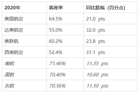 美国航空去年整体客座率64.5%、达美为55%、美联航60.2%、西南航空52.4%;综合看四家,2020年客座率的同比跌幅都超过了20个百分点。