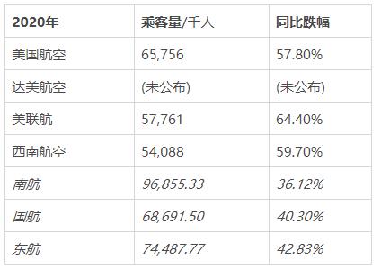美国几大航司的年度乘客运载量跌幅都超过50%,而中国三大航的跌幅则在36%-43%之间。
