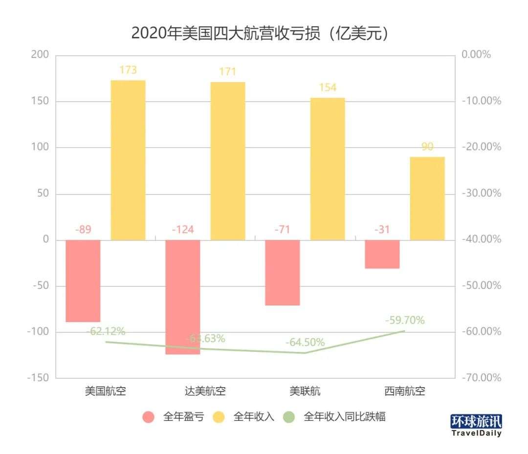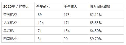全年亏损最多的要数达美航空,亏损高达124亿美元;年度收入跌幅最甚的是美联航,同比下滑64.5%。