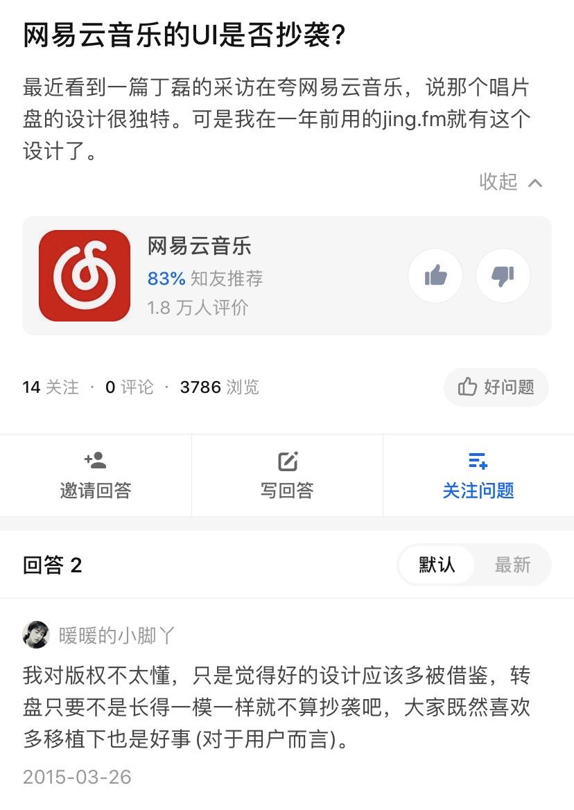 这是 2015 年的一个知乎贴,说的是网易云音乐黑胶唱片播放样式的设计抄袭 jing.fm。后者是 2012 年上线的,比网易云早一年。