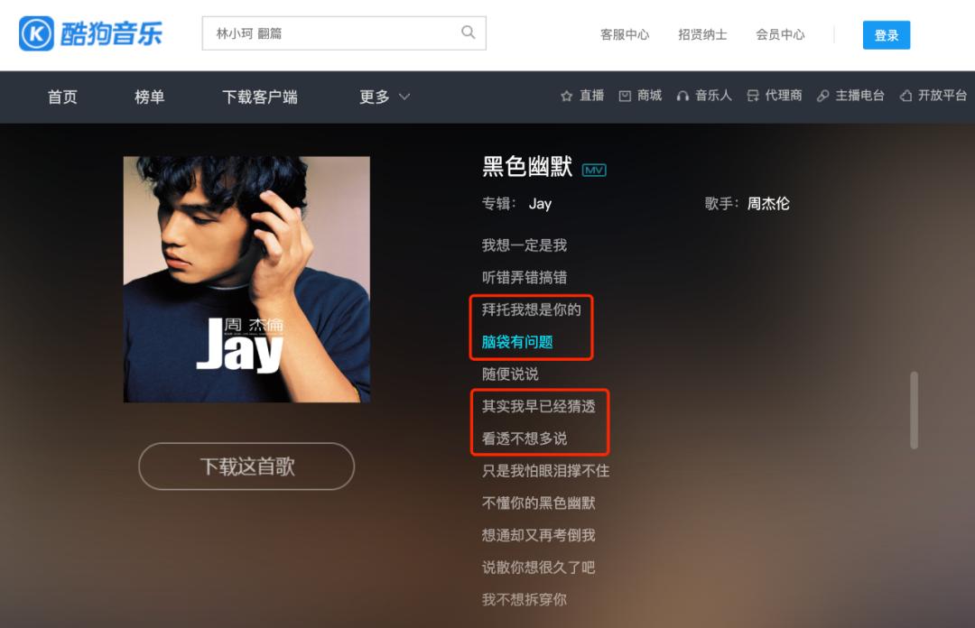 酷狗在自家微博回复里添加了一个链接,这个链接会跳转到周杰伦的一首歌,叫《黑色幽默》。