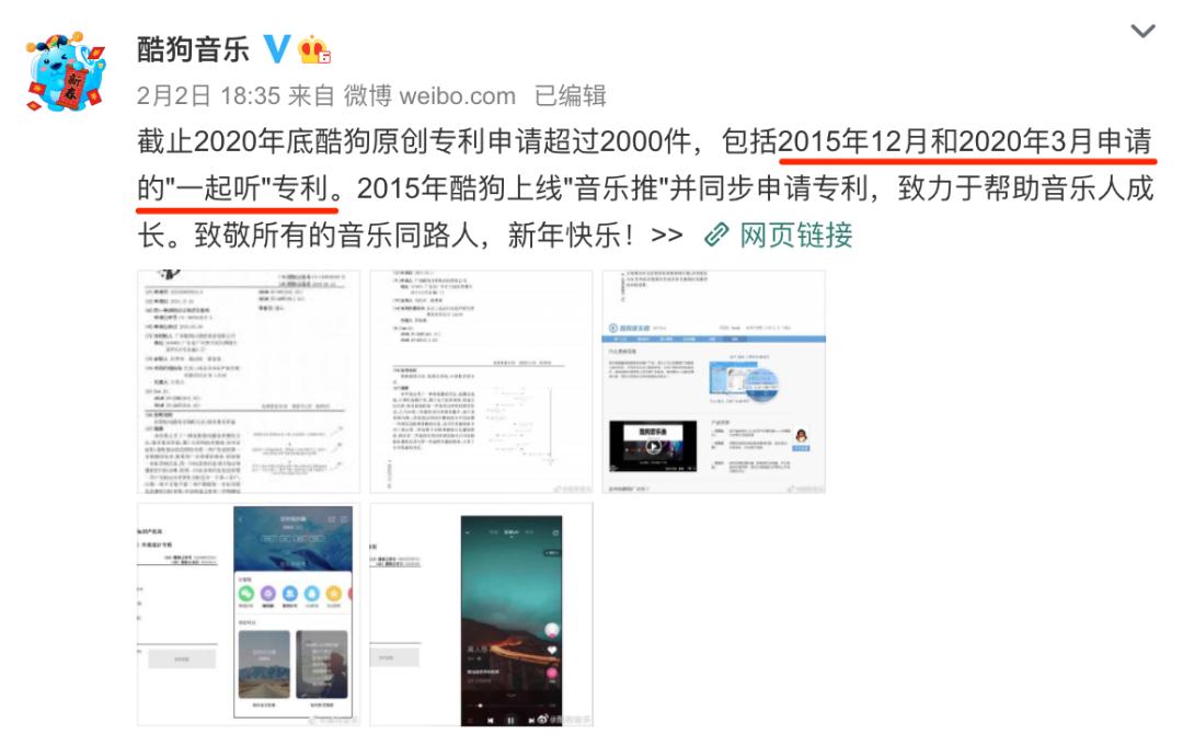 之后,酷狗音乐在官微还晒出了专利截图,产品设计和专利申请时间,都早于网易云上线这个功能的时间。