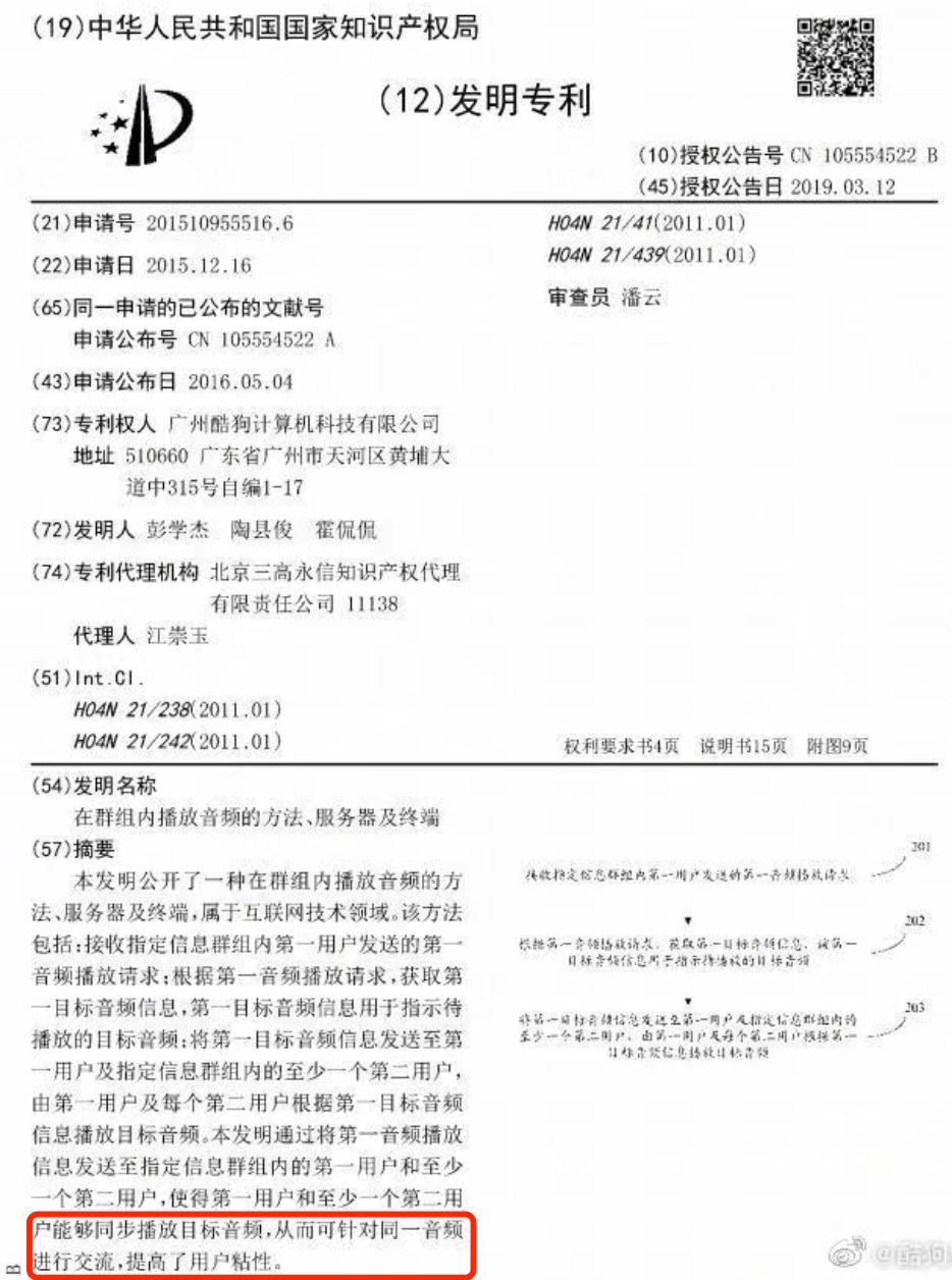 而两人一起听,其实就是最小群的存在。要说专利的覆盖面,酷狗的这个包含的功能场景更多。