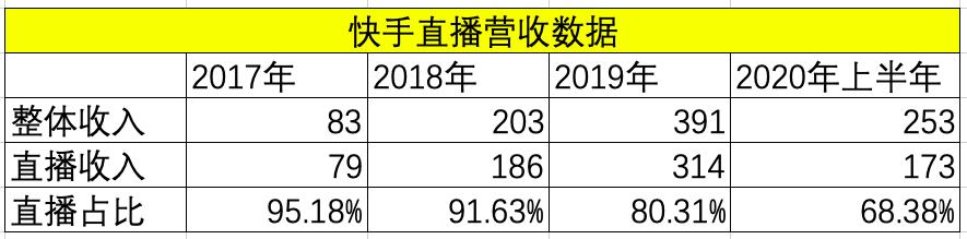 直播一直是快手的主要收入来源,据快手招股书显示从2017年到2019年,公司收入分别为83亿、203亿、391亿元,今年上半年收入253亿元,同比增长48%,其中直播收入分别为79亿元、186亿元、314亿元、173亿元,占比分别为95.18%,91.63%,80.31%,68.38%。一家企业是什么不要看它怎么说,看它的营收构成,可见,直播才是快手的核心业务,是快手的底色。