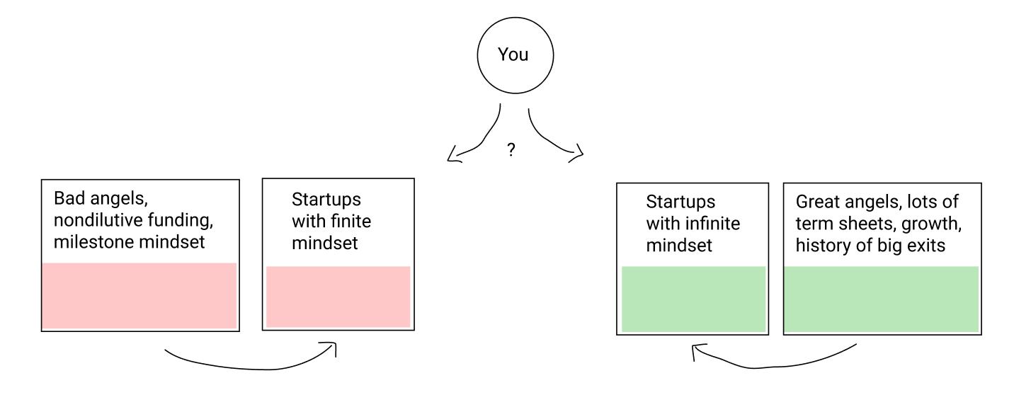 答案其实很简单:生态系统中的创业公司越多,实时发生的投资交易越多,你考虑任何一笔交易的时间就越少,不管有多少投资人,这完全是创业公司数量的函数。而当你只有很少的时间去评估每一笔交易时,你只有时间去问:“什么能做对”。而这是一个以创业公司的条件为前提的谈判。你只有时间去问,创始人是谁,他们的成长速度如何,谁在投资。换句话说,“你是不是在玩无限游戏,你会不会有赛道去做?” 这些都是正确的问题。