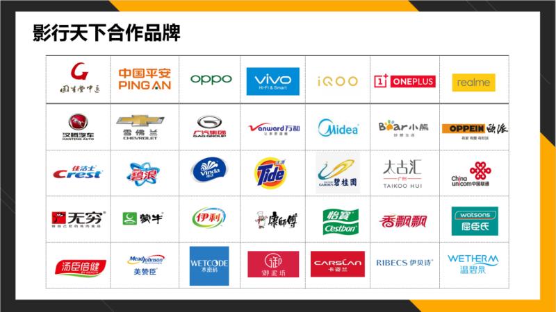 影行天下以品牌短视频营销为核心业务,为抖音首批认证mcn机构、抖音首批蓝v生态全效服务商,与包括realme手机、一加手机、荣耀手机、iqoo手机、美的电器、格力电器、万和电器、小熊电器、欧派家居、平安集团、水密码、卡姿兰、太古汇、碧桂园等超过100个国内外知名品牌达成短视频长期合作关系。