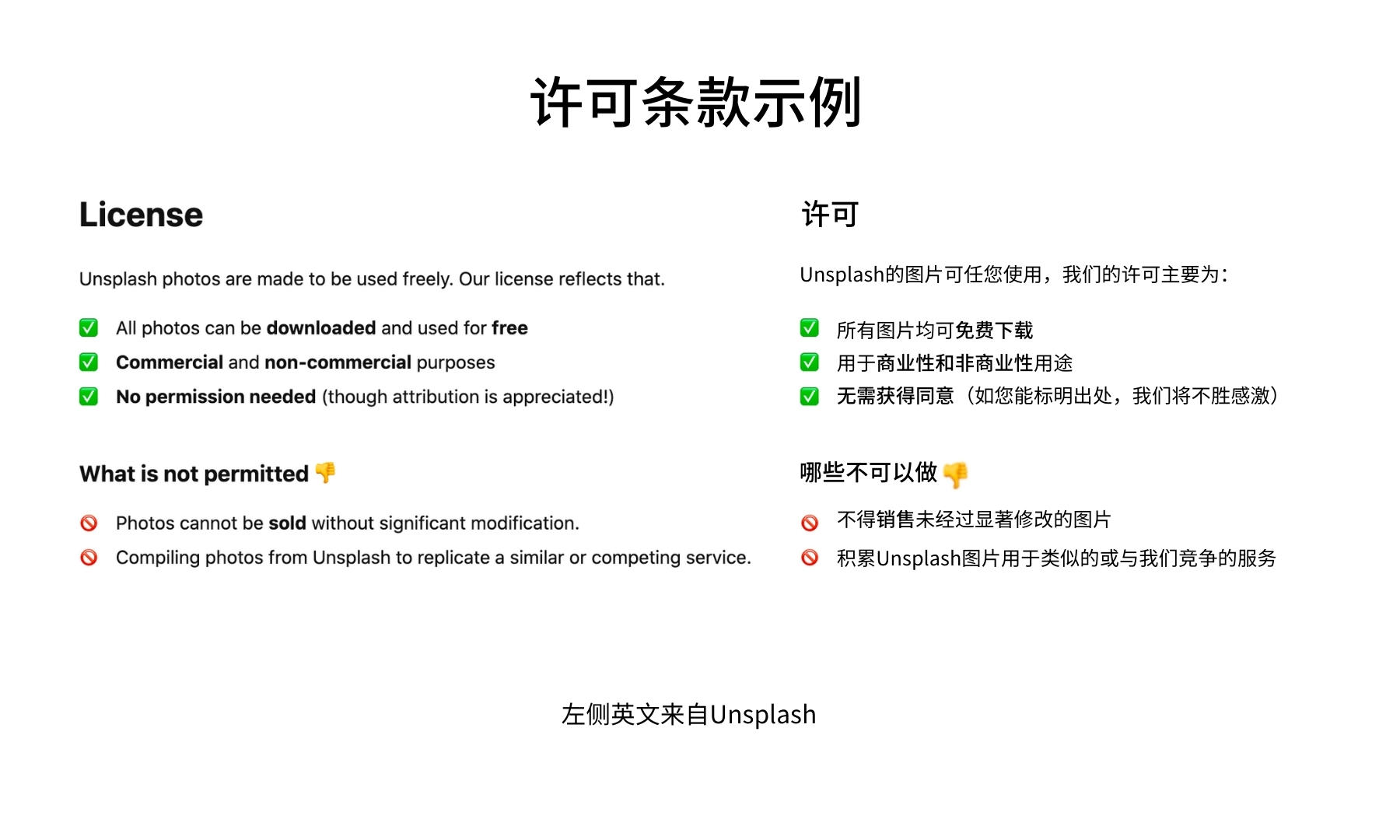 比如,Unsplash在许可条款里提到:任何图片都可以免费下载用于商业和非商业用途,且无需额外获得作者同意,但鼓励在使用时署上作者姓名。图片禁止在未大幅改动的前提下被售卖或用于与Unsplash构成竞争关系的图库中使用。