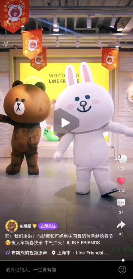 这是Line Friends官方在国内短视频平台的首次亮相,第一个视频点赞量高达137万,吸引了无数粉丝的关注。很难想象,这个原先起始于表情包贴纸的卡通形象,能够在全球范围内长达10年热度不减。甚至从表情包衍生出动漫、游戏、线下体验店等。