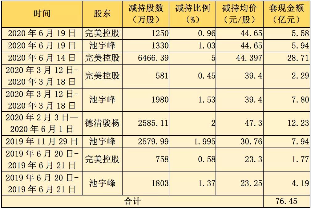 自2019年6月以后,完美世界的股价开始了一轮明显的上涨,2020年7月22日盘中,一度刷出43.16元/股的历史新高。春江水暖鸭先知,相比较资本市场,完美世界内部高层则是最了解公司实际经营情况和发展困境的人,因此开始大量抛售股票。我们之前的文章中也曾提到过,自2019年6月到2020年股价新高之时,三大股东迅速抛售大量股票,套现76亿。