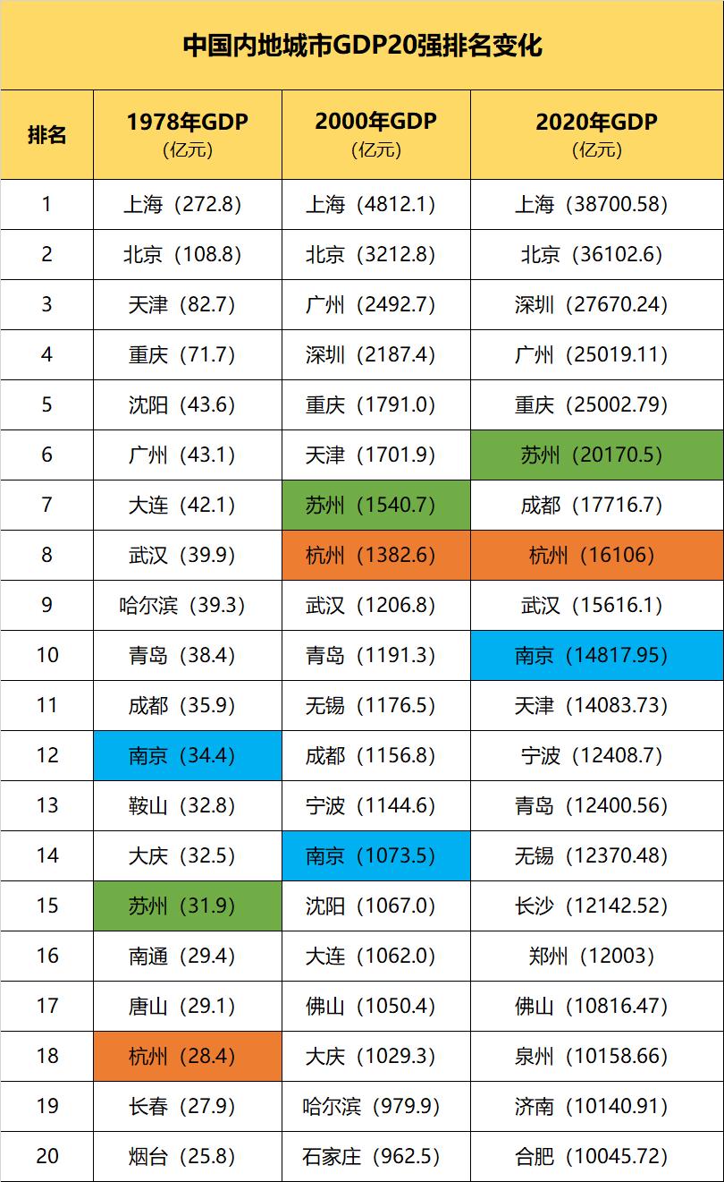据统计显示,杭州1984年GDP排名中国内地第十名,苏州1985年排名中国内地GDP第八名,而南京2020年才首次进入前十。