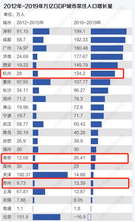 如果看常住人口的增幅,杭州相对苏州、南京的优势更加明显。
