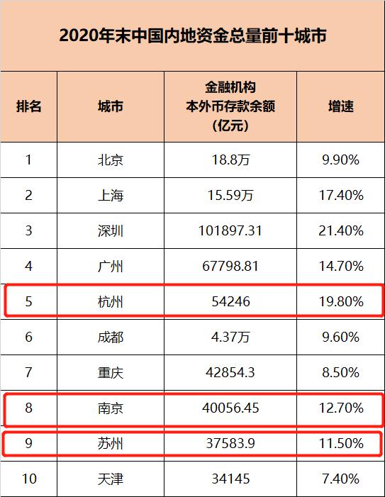 截止2020年末,杭州汇聚的资金总量达54246亿元,南京为40056.45亿元,苏州为37583.9亿元。