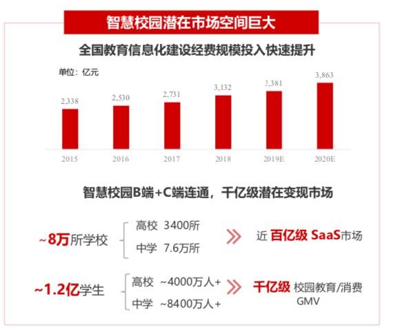 这是一个粘性极高又高度垂直的用户群体,据相关资料显示,我国共有8万多所高校和中学,动态在校学生人数约为1.2亿,背后是万亿的市场服务规模。