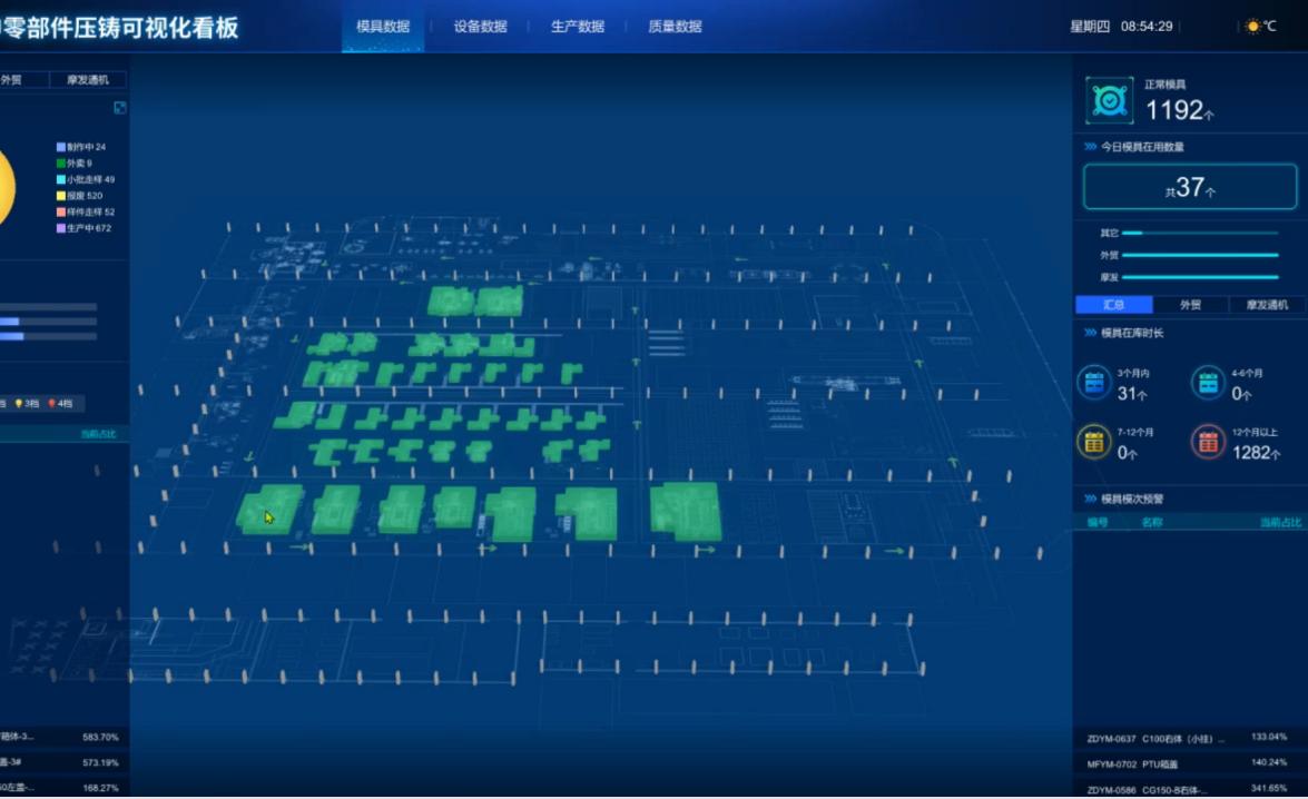 尹云峰:这是我们给某零部件厂做的一个可视化看板。可以看一下,全是3D的layout工厂布局图,每一台设备生产什么,图纸是什么,全都清清楚楚。