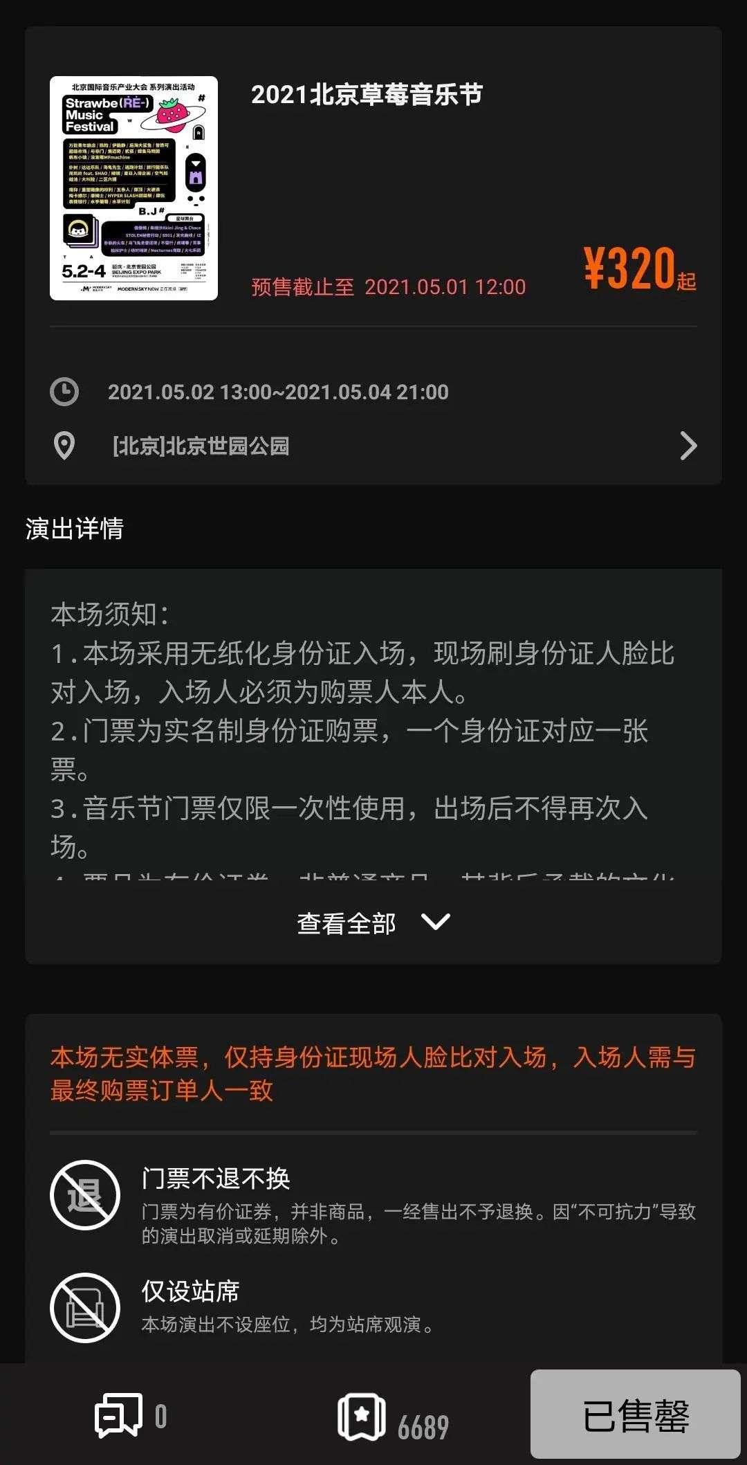 直到现在,我还不停的刷新售票页面,一直在APP上登记缺货信息。但愿我这个五一能够有机会亲眼看到他们的现场。