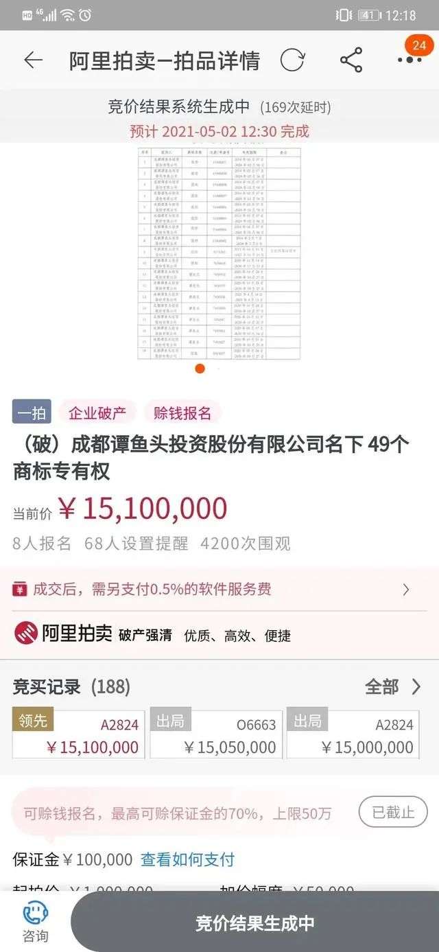 2021年5月1日10时至5月2日10时,成都谭鱼头投资股份有限公司(成都谭鱼头)管理人在淘宝网阿里拍卖强清平台,对成都谭鱼头名下的49个商标专有权进行拍卖,起拍价为100万元,共8人报名竞拍。