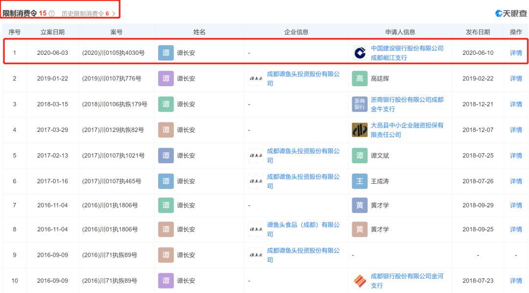 谭长安也多次被限制消费。最近的一次是2020年6月,由中国建设银行股份有限公司成都岷江支行申请。谭长安欠建行成都银行不到5万的金额。截至2018年3月27日,谭长安尚欠建行成都岷江支行借款本金44921.69元、利息2954.52元、罚息1126.94元。