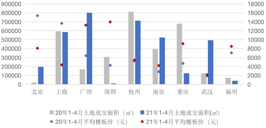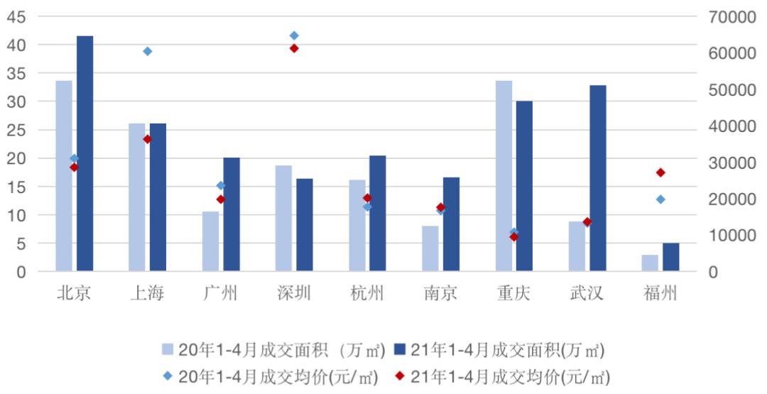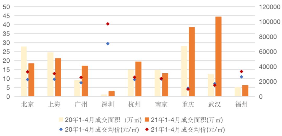 从商办土地市场成交看,2021年前四月重点城市商办土地成交总面积同比上升9.9%,平均土地成交价16610元/平方米,同比上升7.8%,市场重回增长态势。