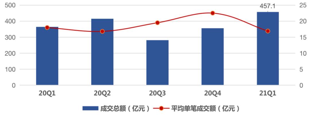 2021年一季度,中国内地大宗物业成交总额457.1亿元,同比上升25.7%;总成交单数共27笔,同比上涨17.4%,交易频率提高,市场活跃度较高。与此同时,外资持续加码内地投资市场,净投资额同比大幅上升74%。