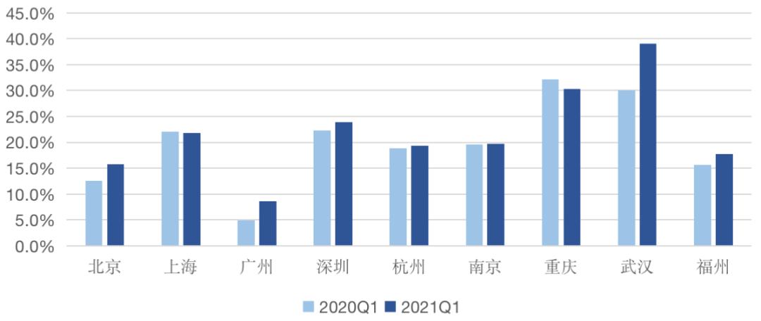 CAIC监测重点城市中,2021一季度与2020一季度同比空置率上升为普遍趋势,其中武汉和广州上升幅度较大,武汉受疫情影响,租户退租现象最为严重导致2020全年净吸纳为负,广州则源于近期的供应高峰;