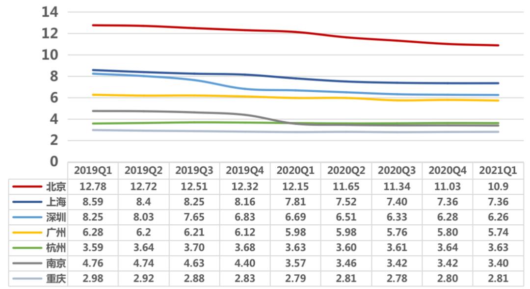 全国重点城市甲级写字楼经历了2020年四个季度的下行趋势后,于2021年一季度降幅收窄明显,基本企稳。北京租金仍占据首位,但与上广深的租金差进一步缩小。