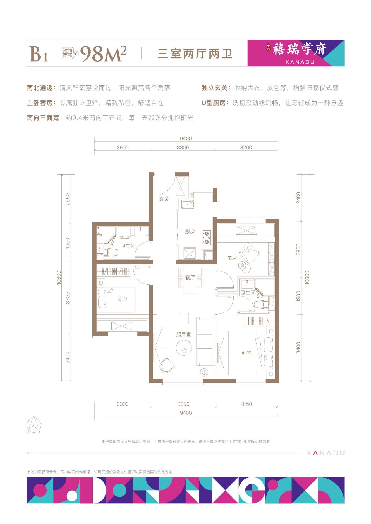在禧悦学府的主力户型中,建面约98㎡三室两厅两卫,以9.4米南向三面宽的尺度,实现了采光Plus;建面约103㎡三室两厅两卫,难得地做到了全明通透设计,轩朗双明卫,拥抱阳光生活。
