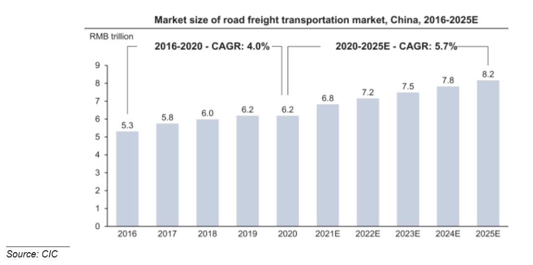 中投公司的数据显示,按物流支出计算,中国的公路货运市场是全球最大的市场,2020年达到6.2万亿元人民币,到2025年,这个数据将增加到8.2万亿元人民币。