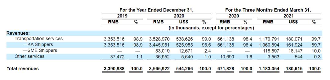 KA业务中,前三大客户德邦快递、京东物流和顺丰又占据了营收的大头。数据显示, 2020 年和 2021 年前 3 月 ,三大客户分别贡献了总收入的 55.8% 和 45.3% 。
