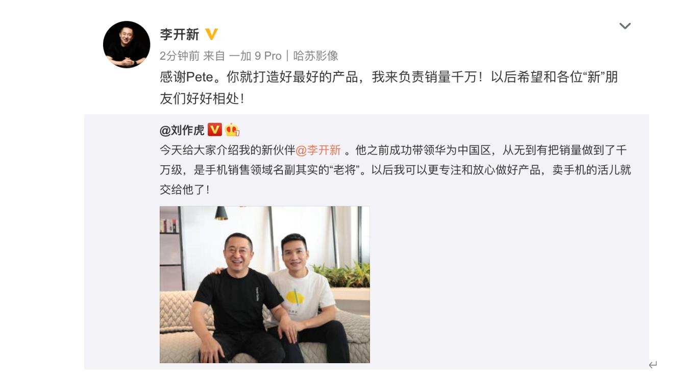 一加手机创始人刘作虎也在微博上发布了这一消息,并表示,“以后我可以更专注和放心做好产品,买手机的活儿就交给他了”。