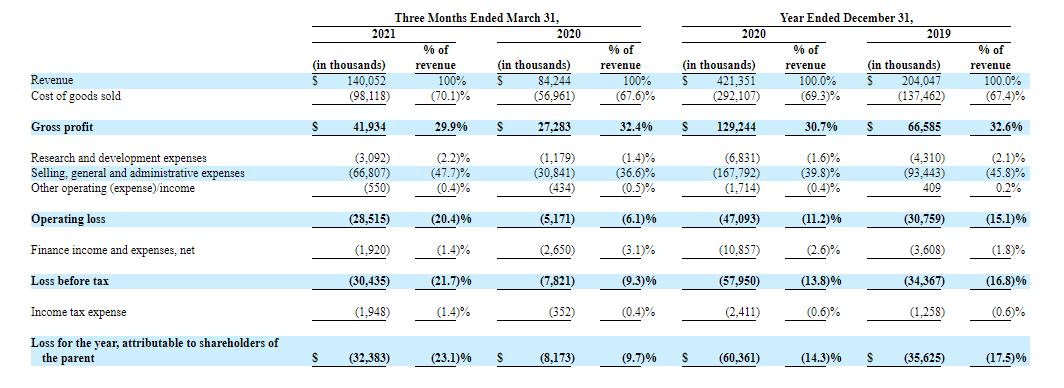 具体来看,在2021年第一季度,Oatly营收为1.401亿美元,较2020年同期的8420万美元增长66.2%。2019年、2020年,Oatly的营收分别为2.04亿美元、4.21亿美元,年增长率为72.9%、106.5%,业绩增长速度令人乍舌;与此同时,其在2019年、2020年毛利分别为6658.5万美元、1.29亿美元,实现了翻番增长。