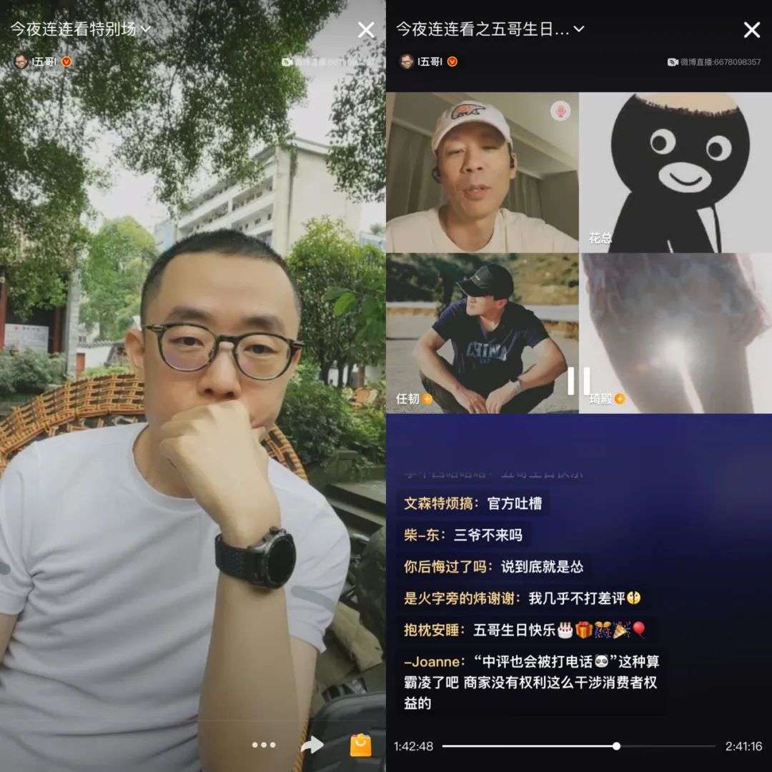 五哥第一次在微博直播连麦源自妻子闫璐。闫璐是微博老用户,与花总、二总互粉。当时闫璐看到二总和花总连麦,觉得这样的聊天方式适合生活阅历比较丰富的人参与,便推荐五哥听。