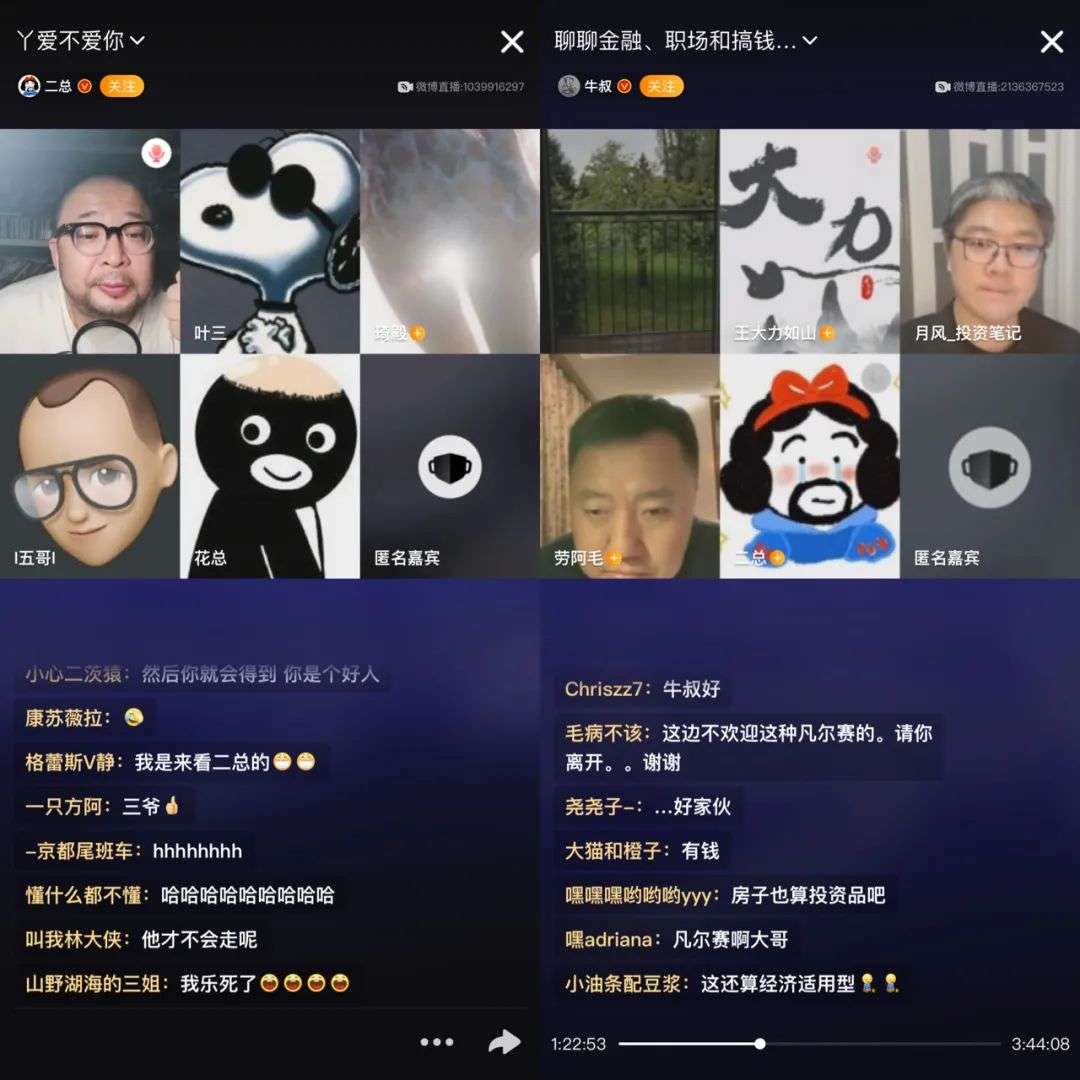 “我开始用闫璐的微博ID和花总连麦,尝试了几次后消除了一开始的紧张感,逐渐体会到连麦这种沟通方式的魅力。”五哥告诉刺猬公社,“于是决定开自己的微博账号,专门用来直播连麦。”