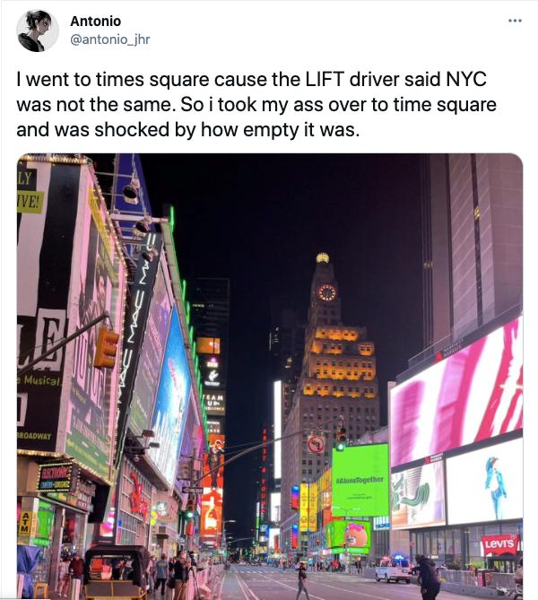 网友在社交媒体上发帖晒出时代广场的照片,并表示,“我去时代广场因为出租车司机告诉我这里已经不是从前。我去了那里,惊讶于时代广场如今有多空。”