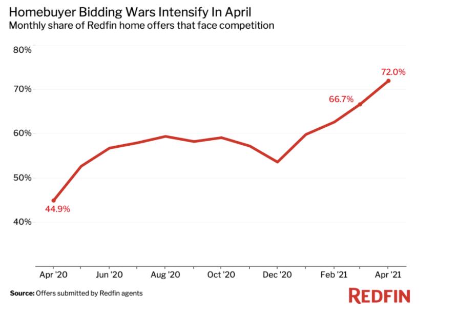 竞价大战,指的是买家在卖家要价(asking price)的基础上加价的金额,加价越多,显示市场的买方需求越旺盛。房地产网站Redfin的最新数据显示,代理的房屋中,有四分之三在4月面临激烈竞价,高出去年同期的44.9%,这也是连续第12个月有超过一半的房源遭遇竞价。
