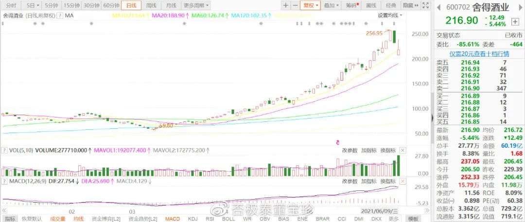 作为今年最牛的白酒股,舍得酒业在2021年3月9日新低55.8元后便一路走高,至6月7日创造256.95元的历史新高,三个月的时间上涨320%左右。